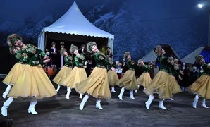 参观结束后,两国元首在“可汗白帐”贵宾席就座,观看由吉尔吉斯斯坦“坎巴尔坎”民俗歌舞团(以乔·伊萨巴耶夫命名)及“阿克马拉尔”国家舞蹈团(以努·图格洛夫命名)联袂呈现的文艺演出。