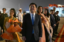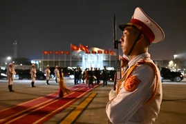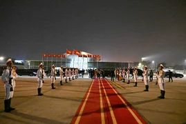 据内阁新闻处通报,河内内排国际机场举行了隆重的仪仗队列队欢迎仪式,并悬挂两国国旗。