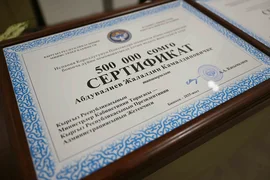 拜伊萨洛夫代表吉内阁总理卡瑟马利耶夫向阿布都瓦利耶夫和其教练颁发了现金证书。