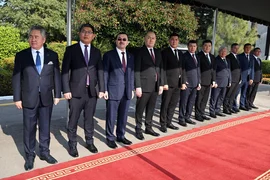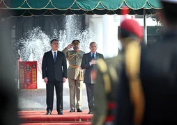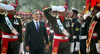 随后,在仪式环节中,萨德尔·扎帕罗夫在仪仗队指挥官陪同下,走过红毯。检阅完毕后,两国领导人简短会见了双方官方代表团成员。
